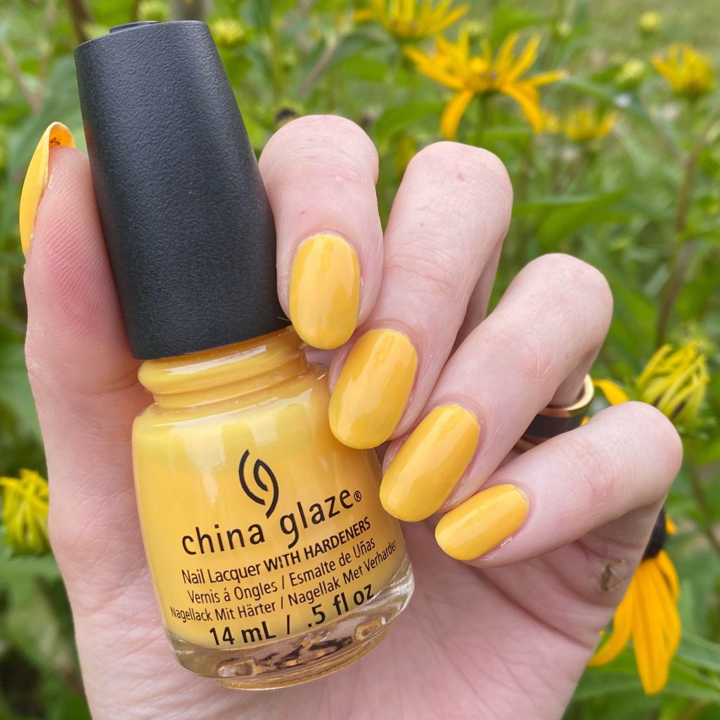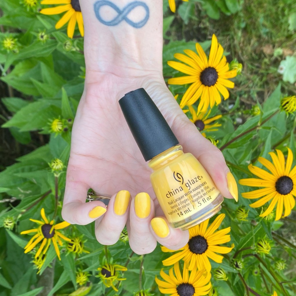 First thing I noticed about the formula on this polish was that it’s thin, & streaky. The second noticeable thing (after looking at other swatches online) is that this shade has definitely faded over the years, because it’s much more yellow than other pictures I see online. Which, considering it’s been tucked away in a dark drawer & shaken well, is disappointing. However, I do still quite enjoy the colour is is which is like a marigold yellow, & I think it’s great for this time of year. & it perfectly matches the brown eyed Susans in our garden.