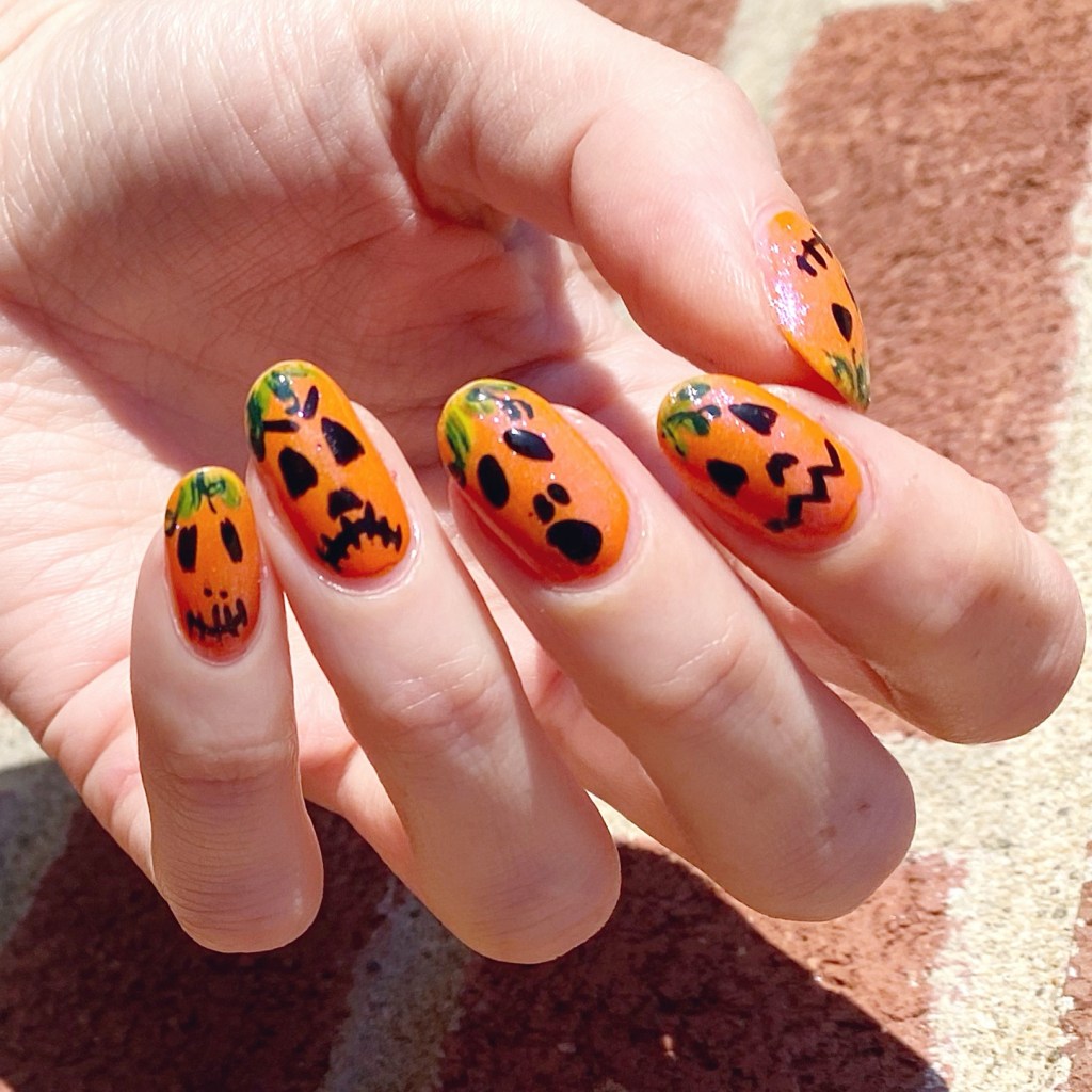 I’m continuing on with my fun Halloween looks with another freehand design. I attempted a cute Jack o Lantern look… & this is how it turned out haha. This is definitely not my best freehand design, but I still think it’s super cute (& a good easy look for someone to do.)