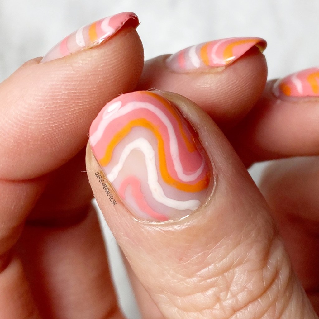 I had this idea in my head of a Springy colours chevron accent nail, & I think it turned out pretty spot on to what I had imagined! The pop of peach/orange are so much fun against the pale pastel of the mint & baby blue. I am pretty much in love with the whole colour pallet!