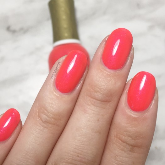 Above you can see the fuchsia shimmer both in the bottle & a close up on my nails. I love how it looks because it takes what could just be a coral neon & transforms it to a something little extra which gives it a serious POP! on the nail. & I also think it makes this polish a great transitional shade for the end of Summer as well–this paired with a maroon or darker Fall shade in a half moon or chevrons would make for an awesome almost Fall design.