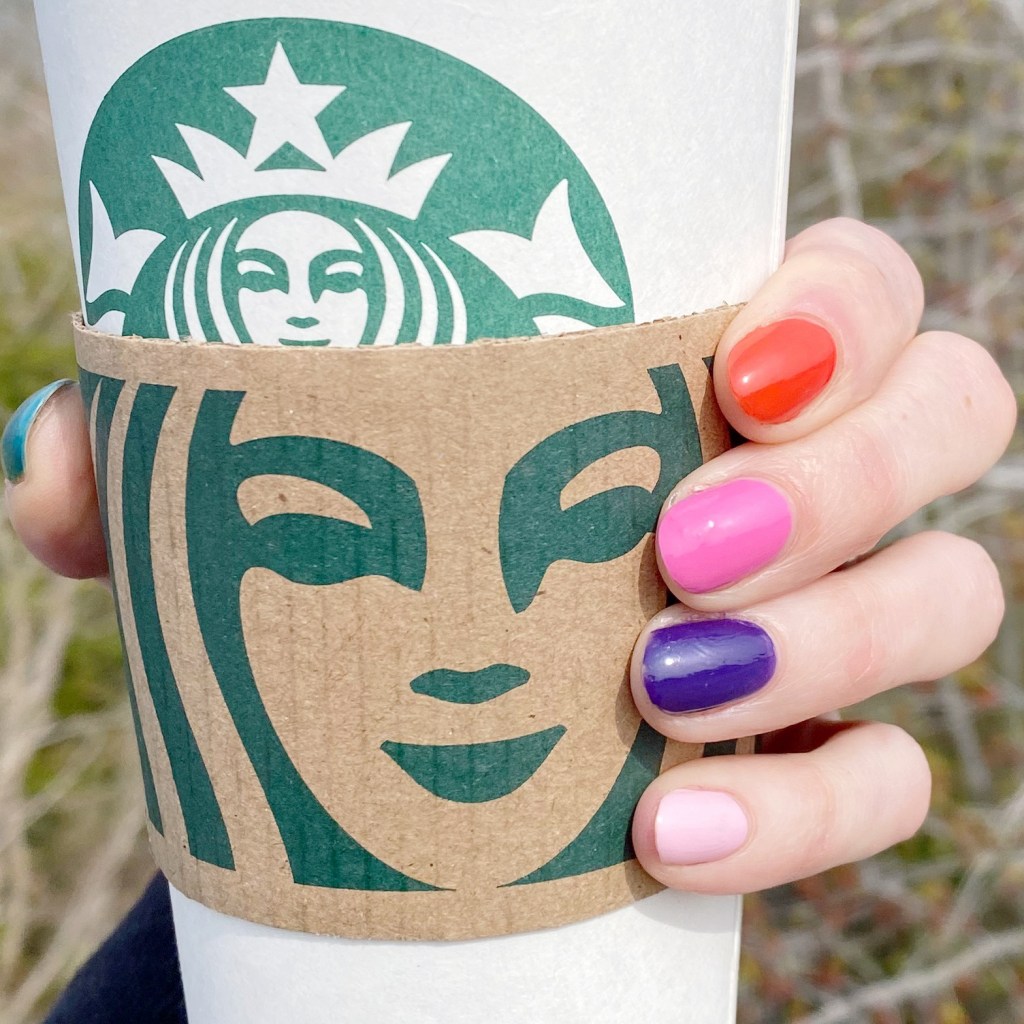 What do you think of my skittle design? I was this close to adding little white “s” on each nail after my co-worker said they reminded her of berry skittles (we work in a candy store, so it would be very fitting!) but I ended up feeling sick that night & not having the energy to do it. Even still, I absolutely love this colour combination. It just looks so good together.