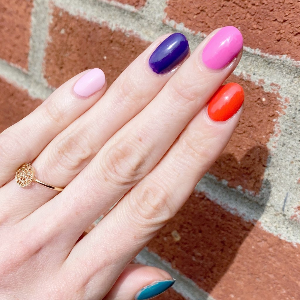 Today I’m sharing an easy November look. One of the things I feel myself drawn to this time of year is jewel tones. Even though I’m not feeling full on holiday nails quite yet, I do enjoy holiday nail polishes from years past. So I thought I would combine a few fun ones from years past into a gorgeous skittle.