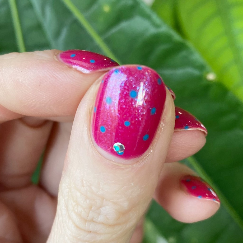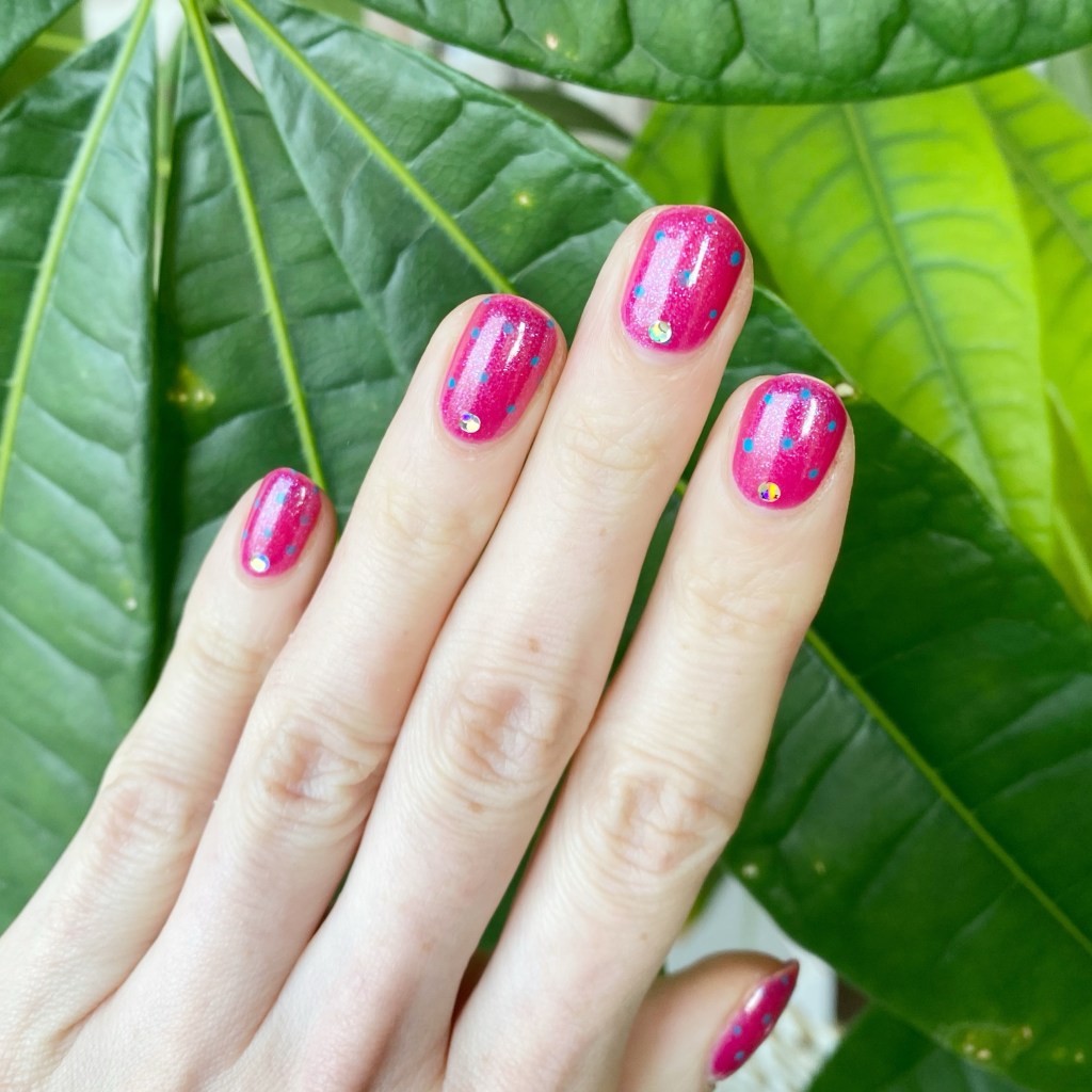 So let’s brighten things up with some pretty nails. I was feeling a simple dotticure the other day, so I decided to pair two very vibrant shades together for it! & it felt like it needed a little something extra added to it, so I gave it a little extra sparkle!