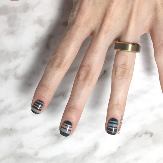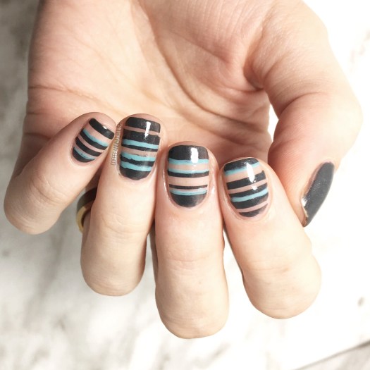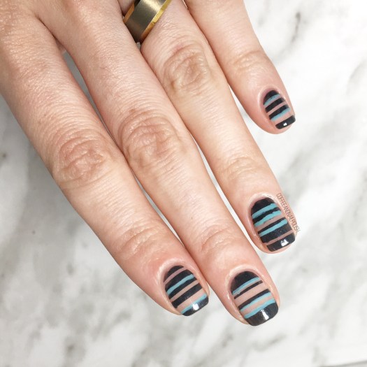 These were so simple to do & I love the pop of colour against the dark grey polish. All I did was apply my different sizes of striping tape over my completely dry base coat, & then painted over top with Cashmere Bathrobe. Then I took my small detail brush & added stripes of Where’s My Chauffeur? freehand. Definitely one of my favourite Spring polishes & it works so well with Cashmere Bathrobe because it stands out so much! You can never go wrong with a good turquoise nail polish.
