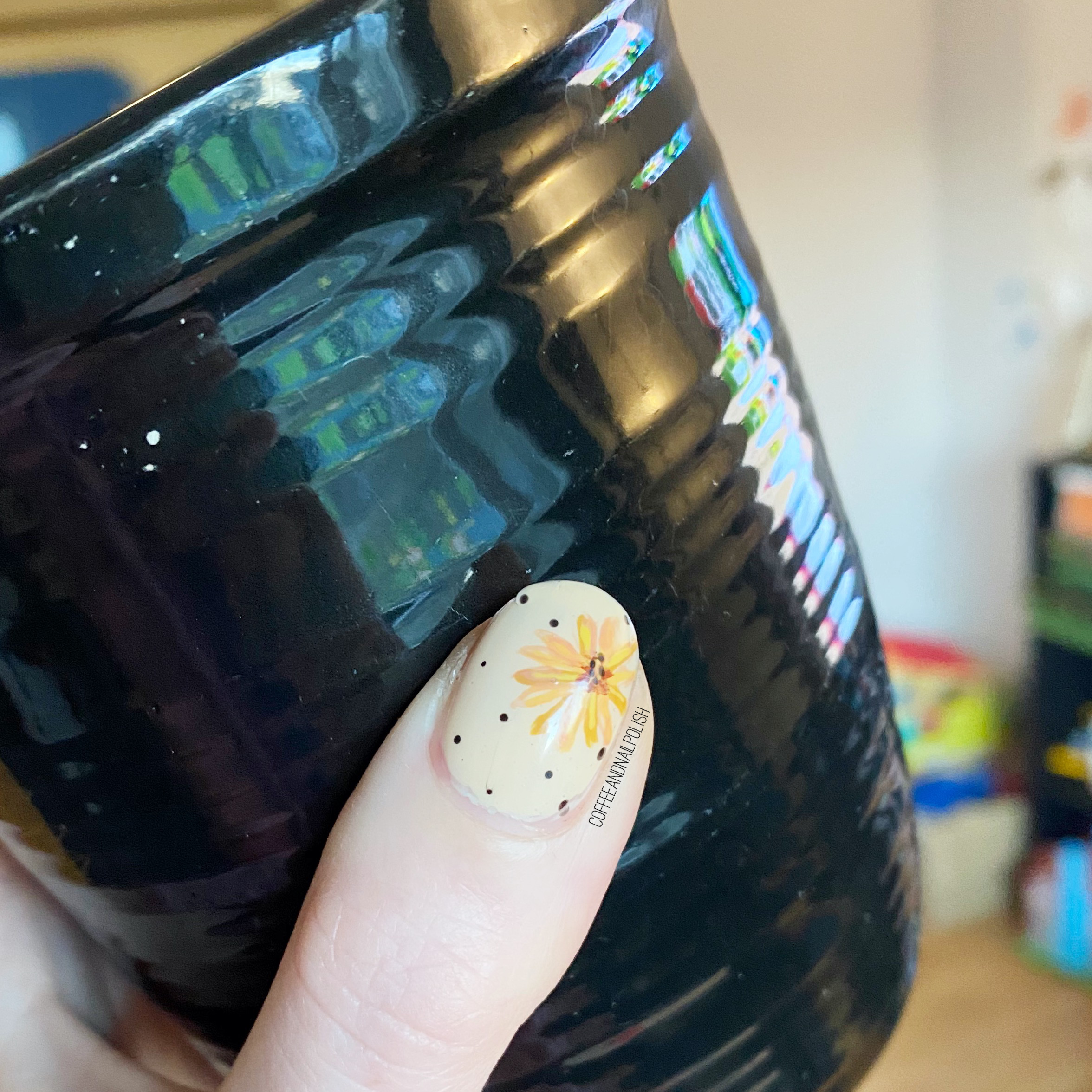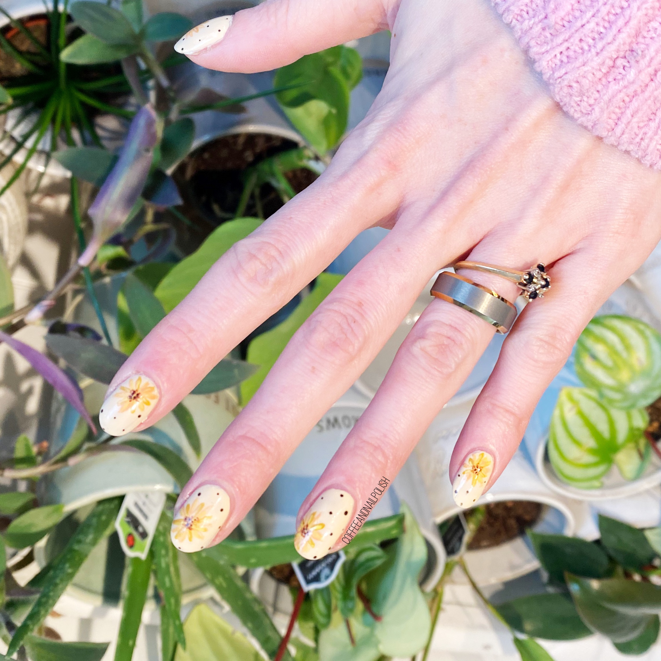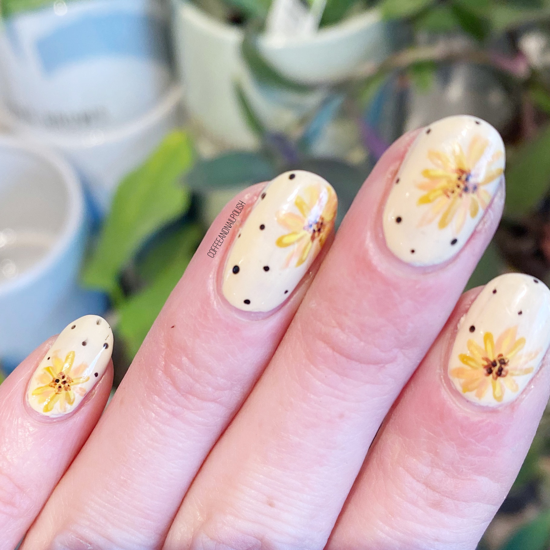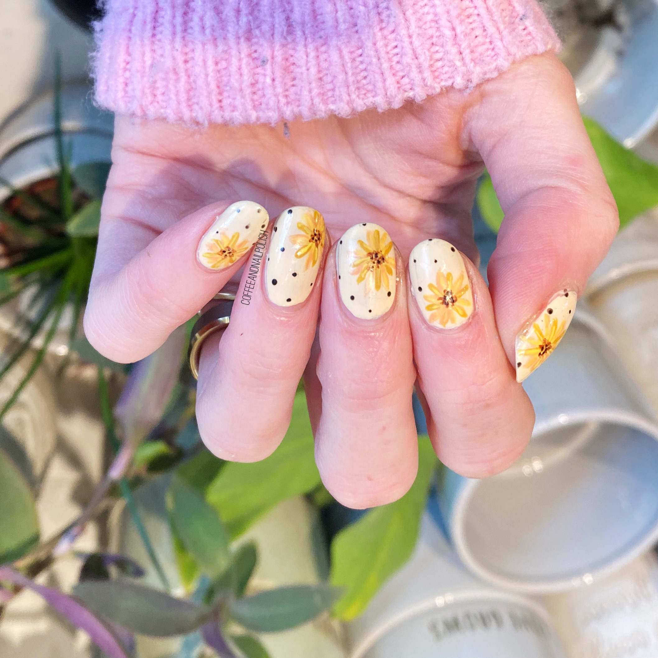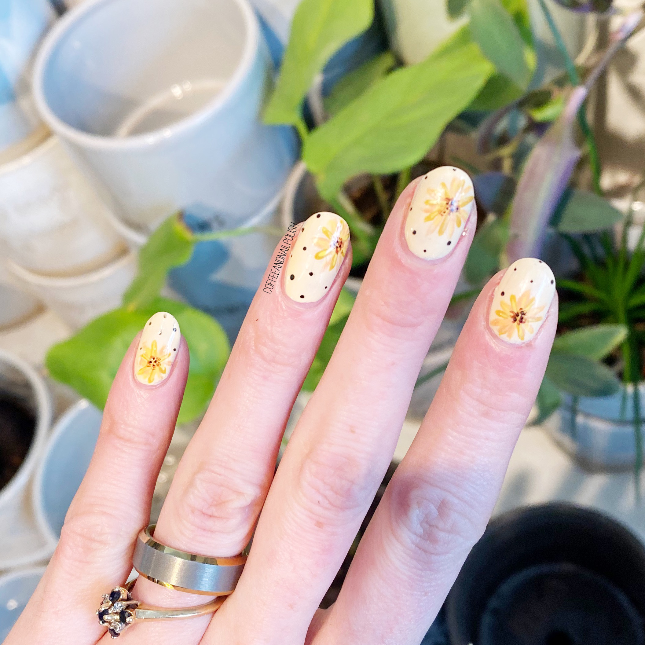 It’s rainy, and yucky here, but it could be worse — it could be snow. So I will take the rain. Today I have a pretty floral look to share with you to brighten up your day. They’re a bit Sunflower-esque. This nail design was actually prompted by a co-worker of mine who told me I should do yellow nails with yellow flowers. & so this design was spawned.